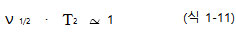 즉 높은 에너지 상태에 머무르는 평균시간은 T1보다 길 수 없기 때문에 에너지 차이 △E는 h/T1만큼 분포되어야 하고 여기에서 생긴 NMR 피크의 넓이는( v 1/2) 적어도 1/T1의 함수가 되게 된다. 즉 T1이 짧으면 피크의 넓이는 넓어지고 T1이 길면 좁아지게 된다. 그러나 실제의 NMR 피크는 T1에 의해서 예측되는 넓이보다 더 넓어지게 되는데 이것은 T2에 의해서 일어나는 현상이다. T2 또한 불확정성 원리에 따를 수 있으며 식 1-11로 주어진다.
